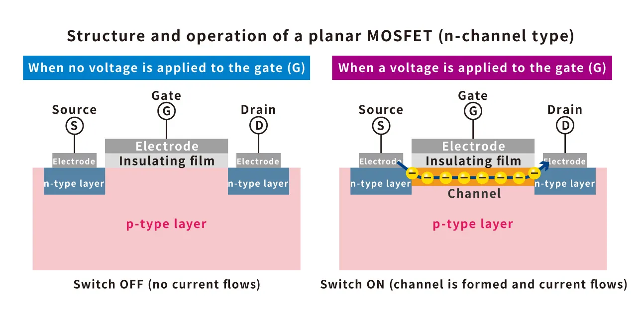 When the applied voltage exceeds a certain threshold, called threshold voltage, the channel becomes conductive (on) and current flows. When no voltage is applied, the channel is blocked (off) and current does not flow. These on/off states are treated as digital information—0 and 1.